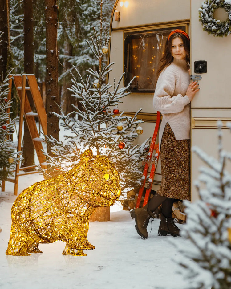 Er schaut freundlich. Und bleibt stehen. Dieser goldene Bär wirkt wie ein Gruß – aus Licht, geformt aus Aluminium, gefertigt in Handarbeit.